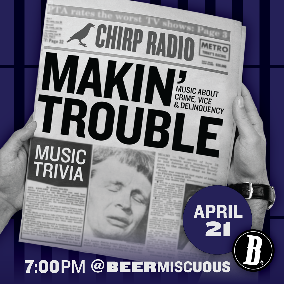 On Tuesday, April 21st, CHIRP Music Trivia will be “Makin’ Trouble” at Beermiscuous, with questions covering songs about crime, vice, and delinquency. From playing dice in the alley, to sipping goof syrup and beyond, test your knowledge of bad habits straight out of the cell block with host Liz Mason (that’s me!), and DJ moimoi spinning tunes. And it’s the day after 420, so you know, come on. It all goes down on your permanent record at 7pm. Beermiscuous is located at 2812 North Lincoln Avenue. For more information, visit the event listing here at chirpradio.org.